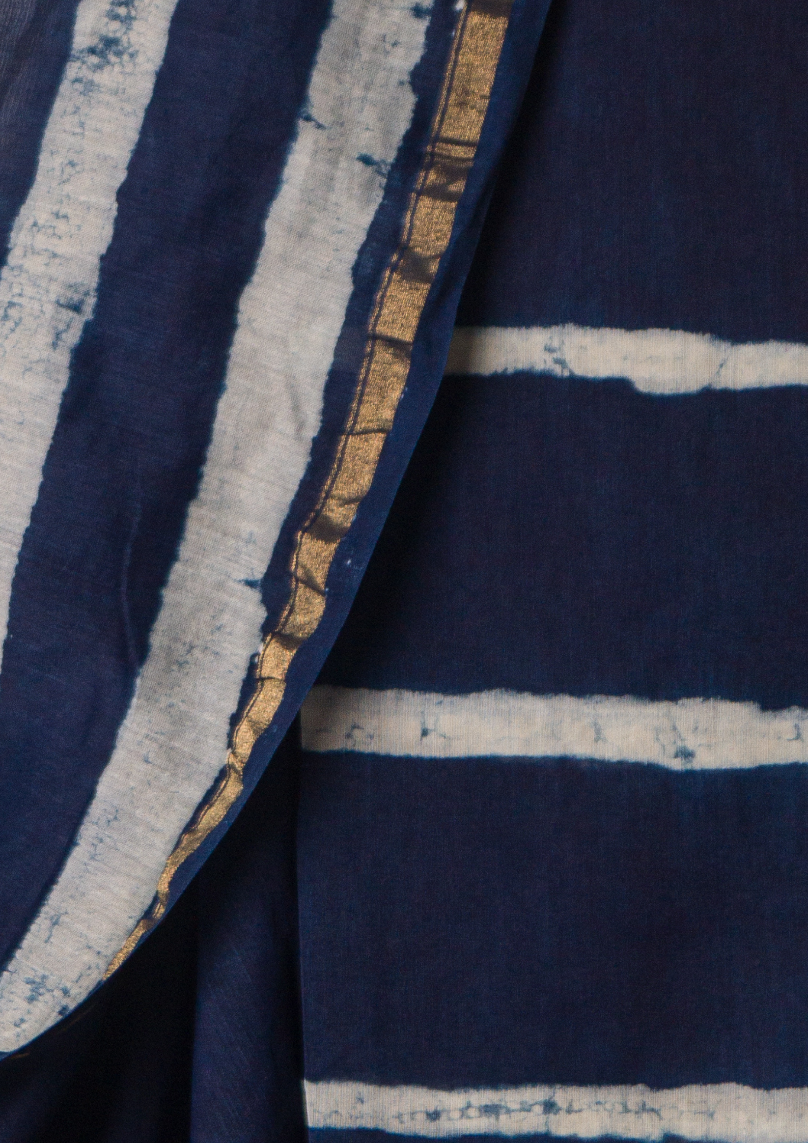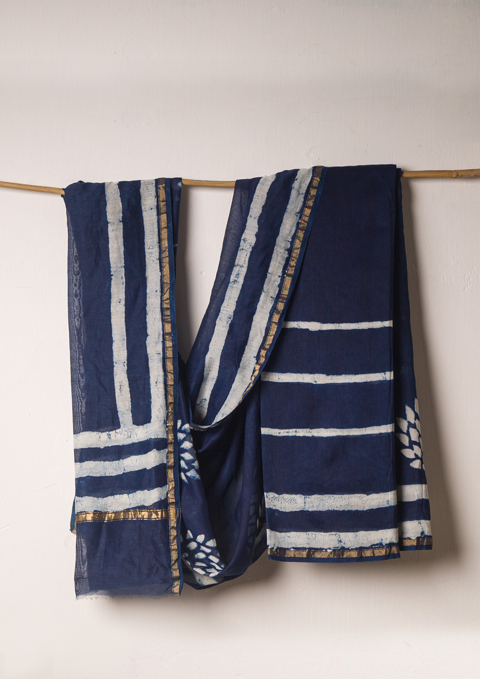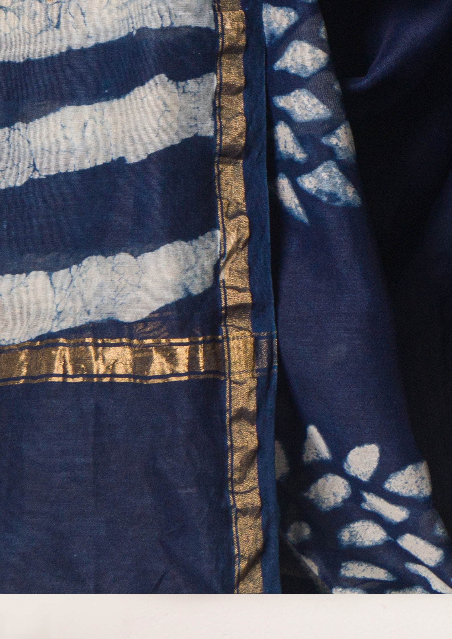 Printing with indigo using the traditional Dabu Technique involves mud-resisting the areas to be printed and then repetitive dyeing and drying until the required colour depth is obtained Characteristic imperfections associated with hand block-printing may be observed, and colours may fade or bleed due to the traditional dyeing and printing process employed.