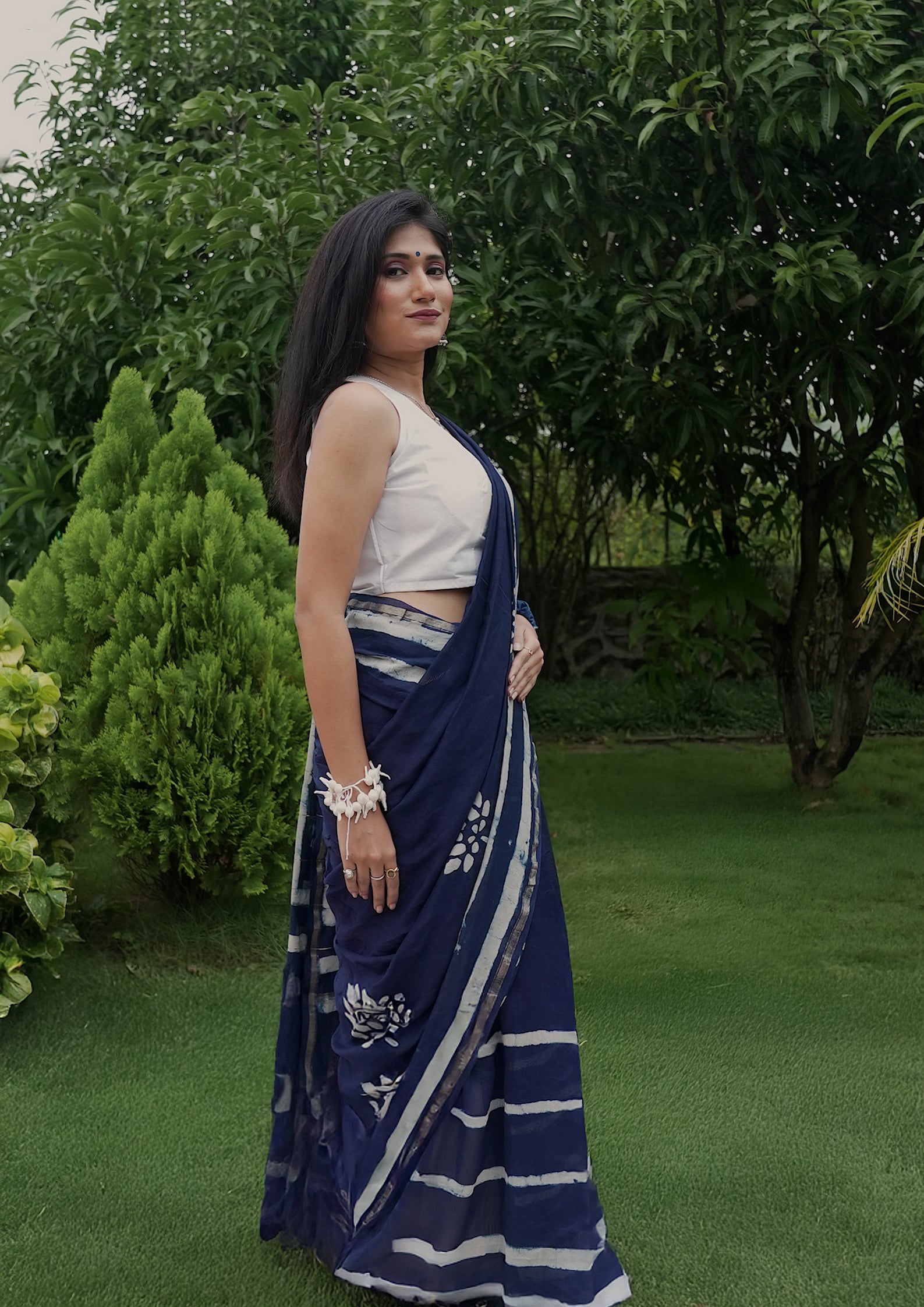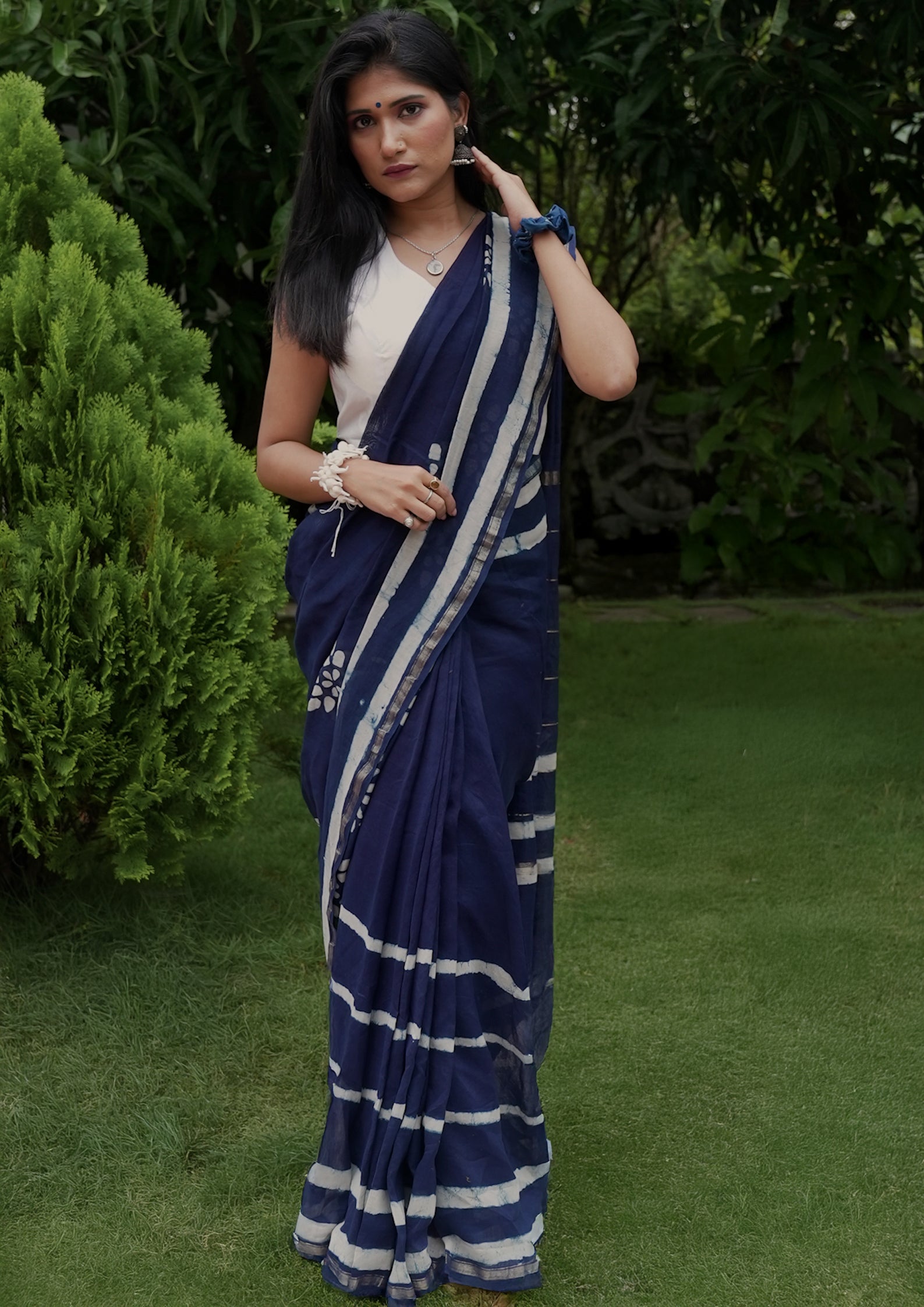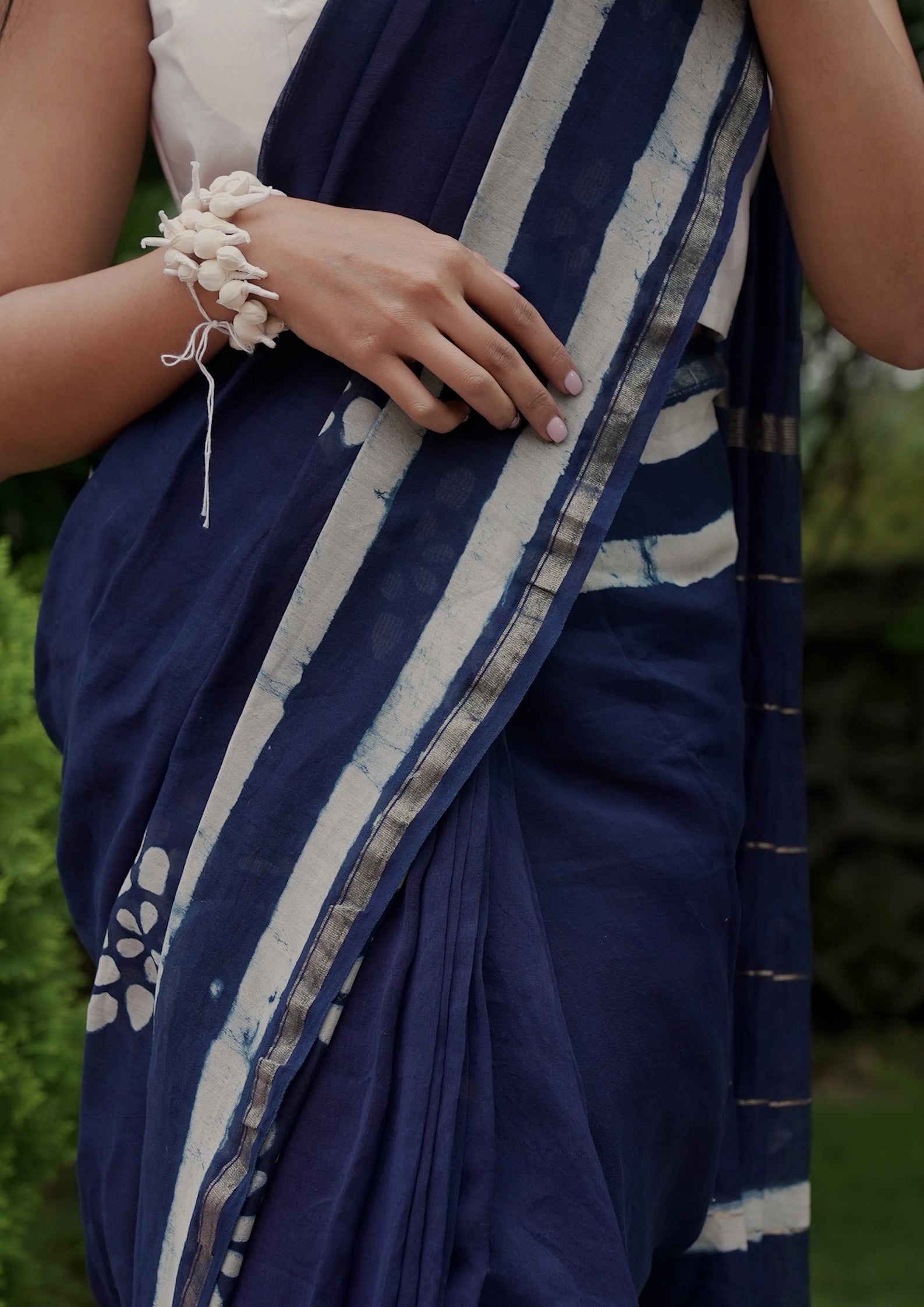 Printing with indigo using the traditional Dabu Technique involves mud-resisting the areas to be printed and then repetitive dyeing and drying until the required colour depth is obtained Characteristic imperfections associated with hand block-printing may be observed, and colours may fade or bleed due to the traditional dyeing and printing process employed.