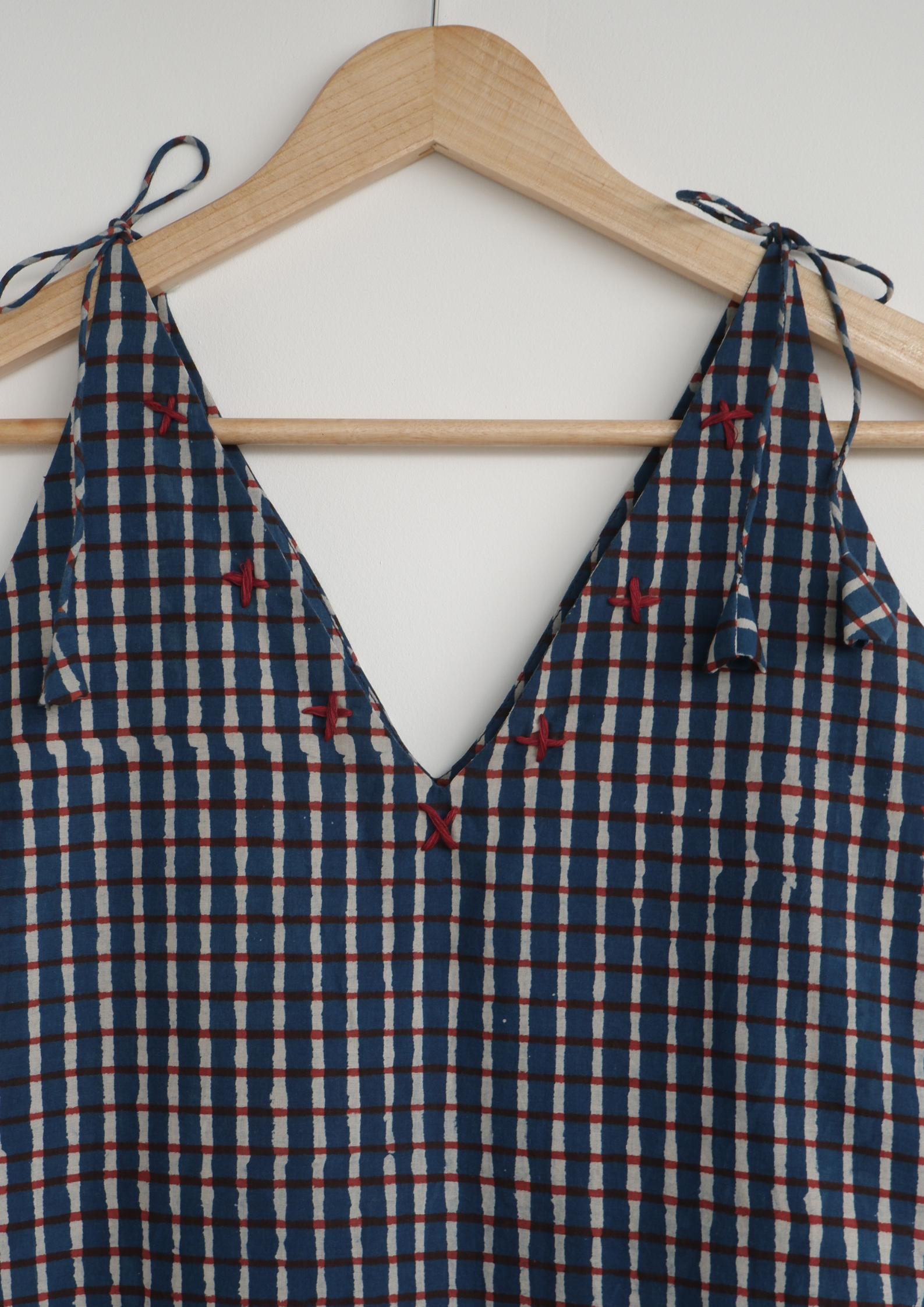- Crafted in 100% pure cotton, this sleeveless short kurti features a flattering V-neckline with delicate tie-up shoulder straps elevated with minimal maroon hand embroidery along the neckline.